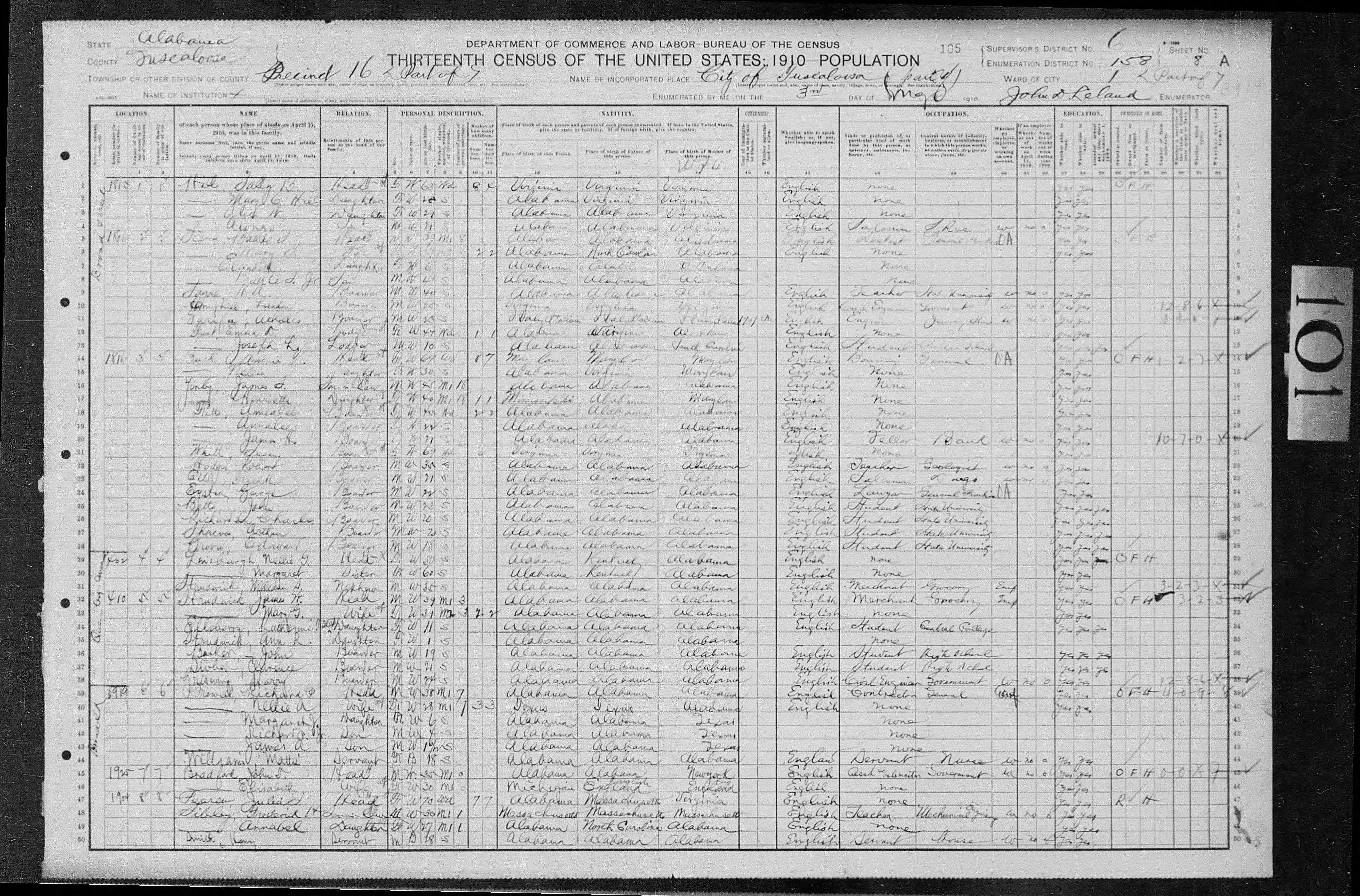 - Year: 1910; Census Place: Tuscaloosa Ward 1, Tuscaloosa, Alabama; Roll: T624_35; Page: 8A; Enumeration District: 0158; FHL microfilm: 1374048