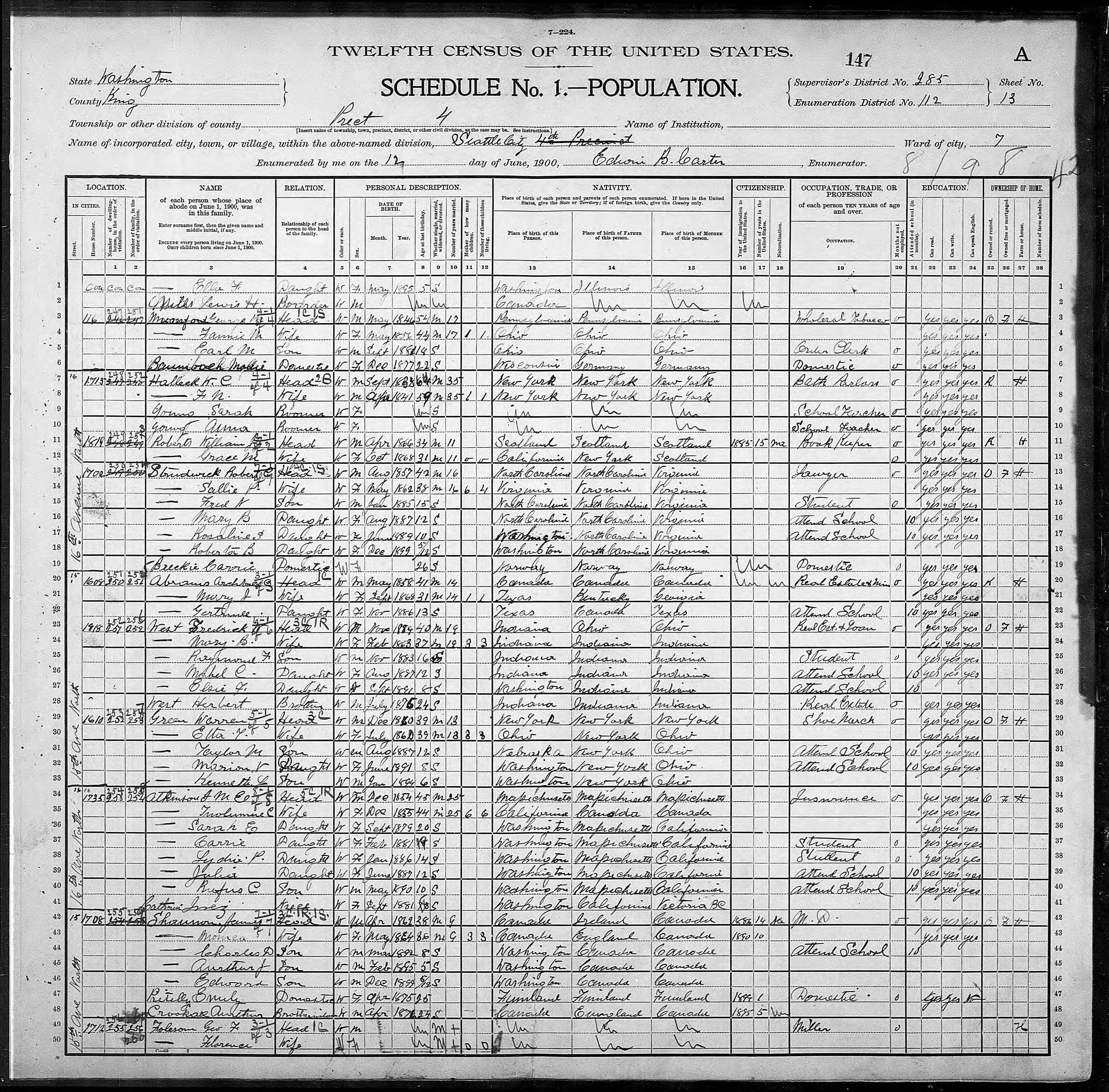 - Year: 1900; Census Place: Seattle Ward 7, King, Washington; Roll: 1745; Page: 13A; Enumeration District: 0112; FHL microfilm: 1241745